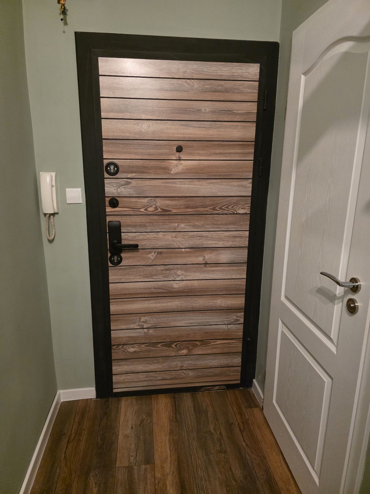 Инсталиране на смарт дръжка ASD H15B с TTLock и антипаник брава върху съществуваща турска входна врата, без необходимост от сериозни конструктивни промени. Решението запазва механичния патрон за авариен достъп и осигурява лесно и сигурно заключване с едно движение на дръжката в обратна на отключване посока.