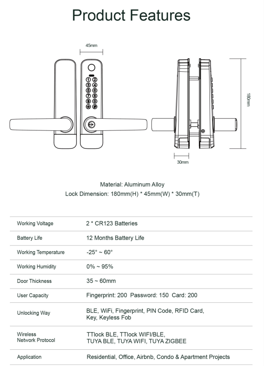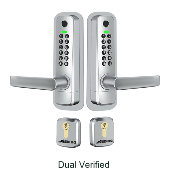 Смарт брава  за двустранен контрол на достъп, с висока влаго и прахо защитеност IP66. Приложима и за използване на открито като дворни врати. Отваряне (достъп) с код, чип-карта, пръстов отпечатък, телефон Bluetooth. Опция WIFI.