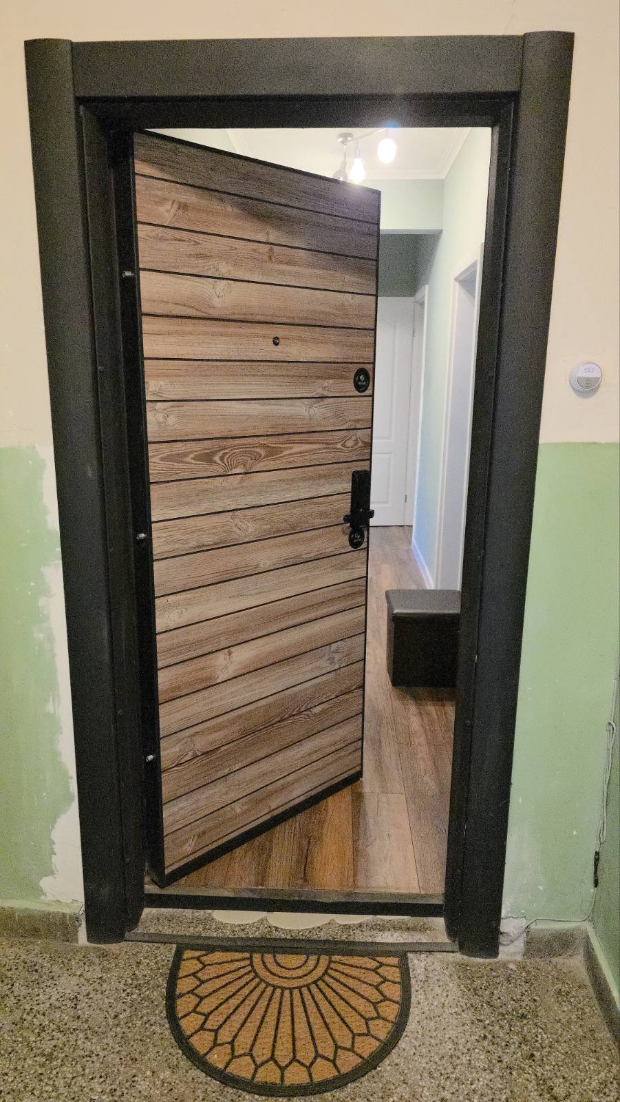 Инсталиране на смарт дръжка ASD H15B с TTLock и антипаник брава върху съществуваща турска входна врата, без необходимост от сериозни конструктивни промени. Решението запазва механичния патрон за авариен достъп и осигурява лесно и сигурно заключване с едно движение на дръжката в обратна на отключване посока.