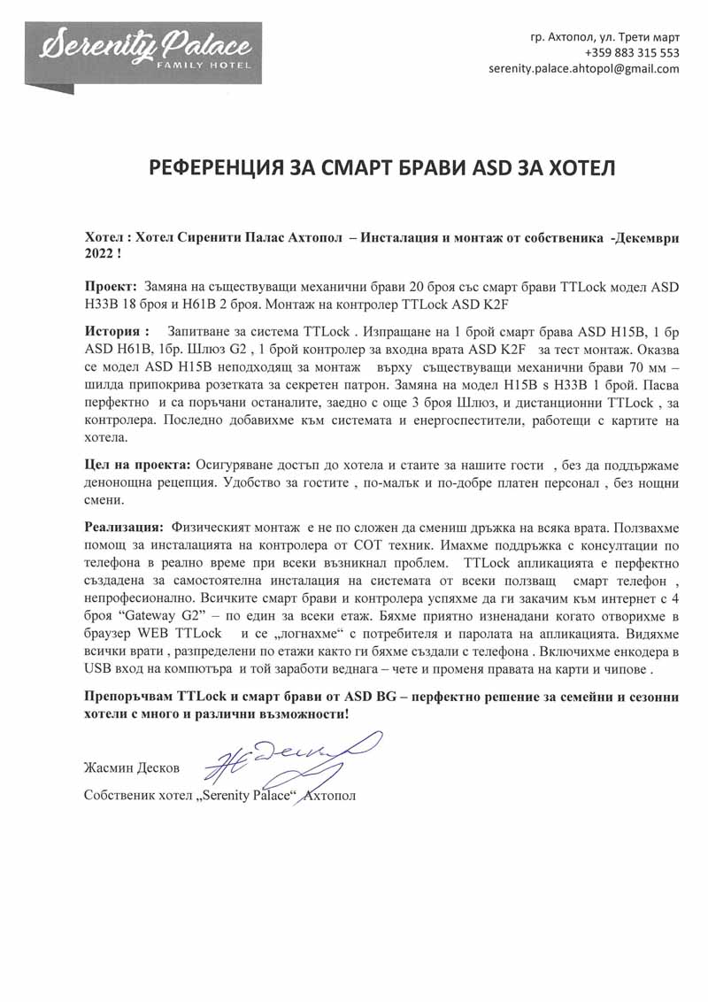 Проект "Hotel Serenity Palace" ноември 2022г - Смарт контрол на достъп в фамилен хотел Серенити Палас Ахтопол 19 стай. Изграждането на тази система ще позволи на собственика да настанява гости без да поддържа 24 часова рецепция. За настаняване на гостите може да се използва код за достъп при отваряне на входа на хотела така и конкретна стая в която ще се намират картите за достъп. Остава и опцията за отдалечено отваряне след телефонно обаждане на госта. Удобство за собственика извън сезона , е отдалечено отвраране за ремонти и поддръжка . За вход в хотела се използва контролер ASD K2F . Всички устройства са свързани безжично с интернет чрез Gateway G2.