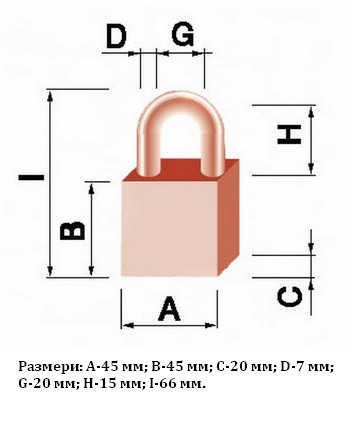 Размери: A-45 мм; B-45 мм; C-20 мм; D-7 мм; G-20 мм; H-15 мм; I-66 мм.