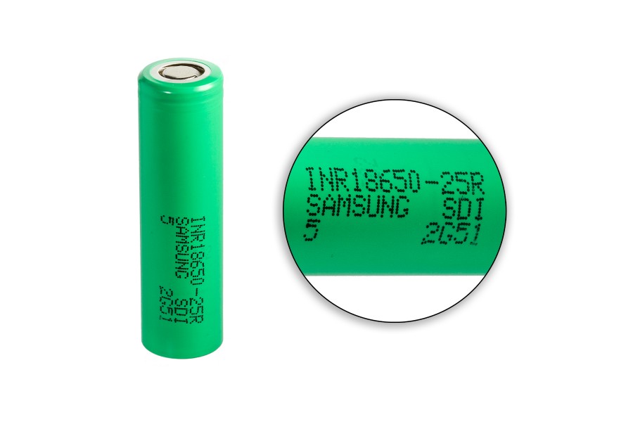 Литиево-йонна акумулаторна батерия Samsung модел INR18650-25R с капацитет 2500 mAh. Това е продукт, специално предназначен за вграждане в силови инструменти. Позволява постоянен разряд с ток 20А, в импулсен режим до 100А за <1 s и до 50A за <5 s. Това го прави подходящ за употреба с електронни цигари. Изпълнение тип 'flat top' (равна площадка на положителния терминал).